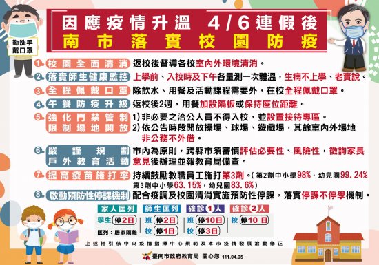 因應疫情升溫,4/6連假後台南市落實校園防疫