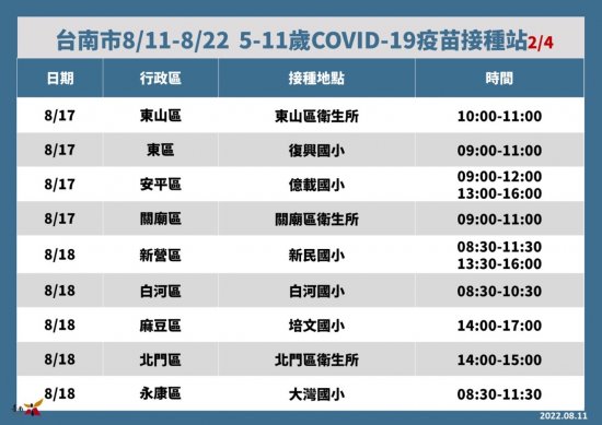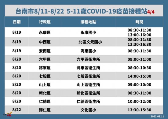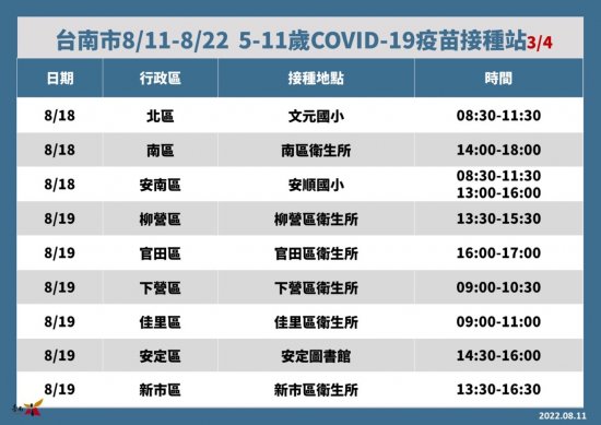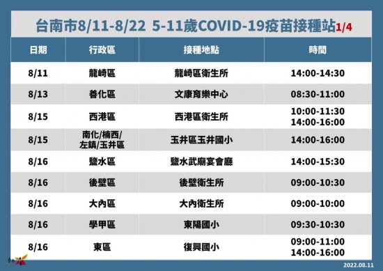 一、依據臺南市政府111年8月11日新聞稿公布5-11歲學童COVID-19疫苗接種站說明辦理。