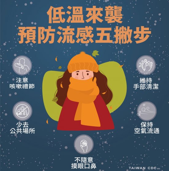 近期氣溫急降,除了注意保暖外,也要注意轉冷後活躍的流感病毒,跟大家分享預防流感五撇步喔!!