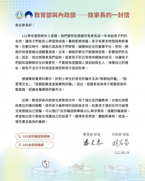 為提升學生及家長之防詐免疫力,以預防近期各式不斷翻新的詐騙手法,教育部與內政部跨部會合作,區分不同年齡教育階段分別製作「教育部與內政部-致家長的一封信」(含反詐騙圖卡),以整體性提升學生及家長識詐之能力,避免成為詐騙受害者。