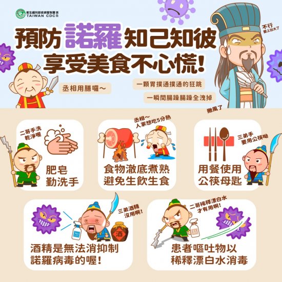 諾羅病毒活躍於秋冬兩季,主要透過糞口傳染,常造成嘔吐、腹痛、水樣腹瀉、部分患者更可能有發燒等症狀! 備餐、用餐都需特別注意,除了落實個人手部衛生且盡量避免生食、生飲,並選擇有信譽的食材供應商~ 酒精和乾洗手對諾羅病毒是無效的,要用肥皂洗淨雙手才能和病毒說掰掰唷!