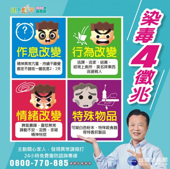 校園毒品危害防制宣導「吸毒傷身又害命,拒毒反毒真歡喜。 人生夢想要追尋,無毒世界真美麗」。