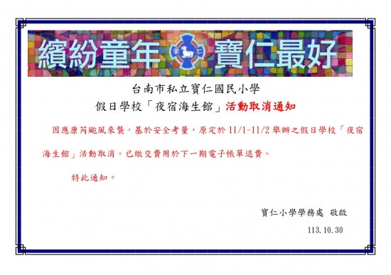 因颱風來襲,11/1-2假日學校-夜宿海生館第一梯次活動取消