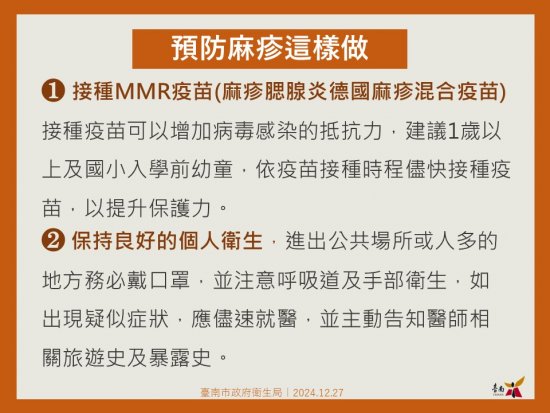 ⼀、依衛⽣福利部疾病管制署本(114)1⽉7⽇新聞稿指出,我國去(2024)年迄今累計33例⿇疹病例,年齡介於20多歲⾄50多歲,其中21例為國內感染病例(含4起群聚),另12例為境外移⼊病例。⿇疹為⾼傳染性疾病,可經由空氣、⾶沫傳播或接觸患者⿐咽分泌物感染,出疹前後4天均具傳染⼒,若出現發燒、⿐炎、結膜炎、咳嗽、紅疹等症狀,應提⾼警覺儘速就醫診斷,以阻斷疫情傳播。